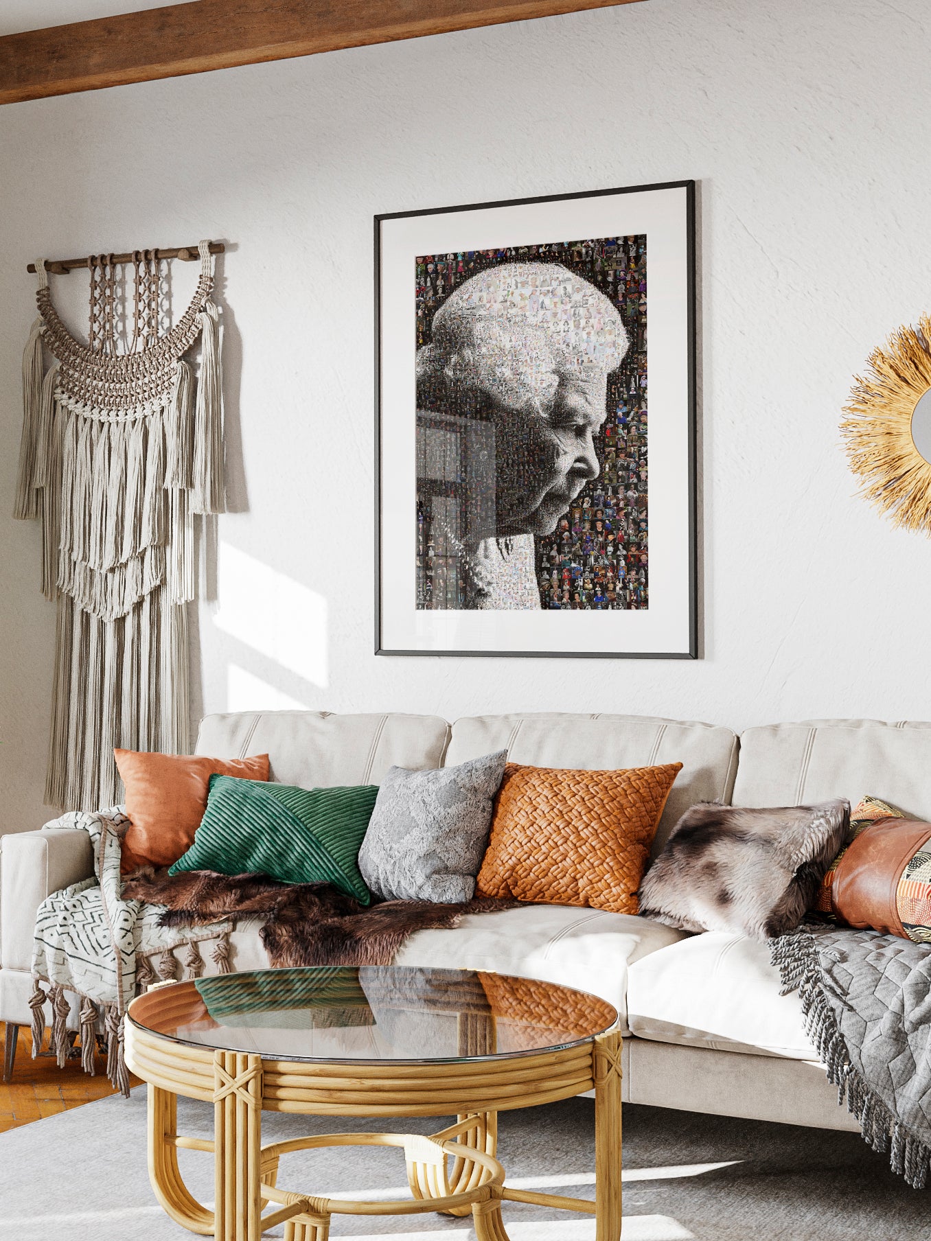 Celebrate the legacy of Queen Elizabeth II with this stunning mosaic artwork. Featuring a captivating portrait set against the iconic Union Jack, this piece beautifully combines elegance and historical significance. Perfect for royal enthusiasts and art lovers alike, this artwork makes a striking addition to any home or office decor. Bring a touch of regal charm into your space and honor the remarkable life of one of history's most beloved monarchs.