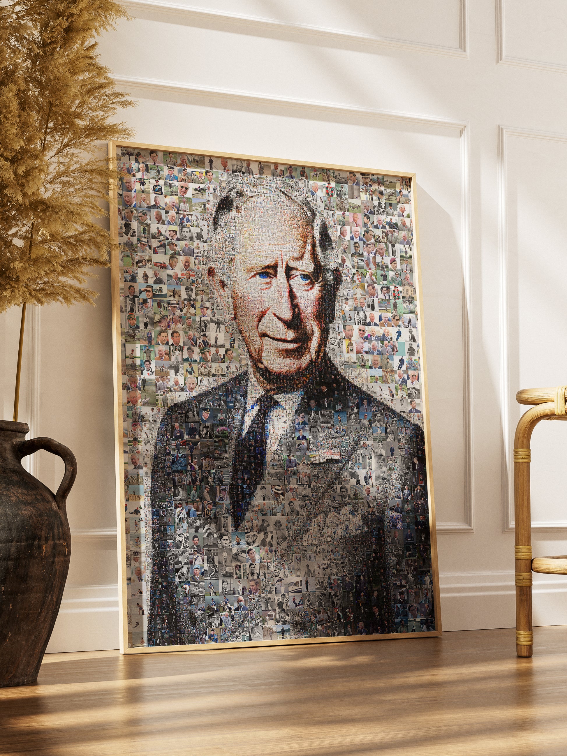 Discover this exquisite mosaic artwork featuring King Charles III of the United Kingdom. This unique piece captures the essence of the monarch with vibrant colors and intricate details, making it a perfect addition to any home decor or royal memorabilia collection. Ideal for art lovers and admirers of the British royal family, this artwork serves as a striking focal point for living rooms, offices, or galleries. Celebrate the legacy of King Charles III with this timeless masterpiece that combines artistry and royal heritage.