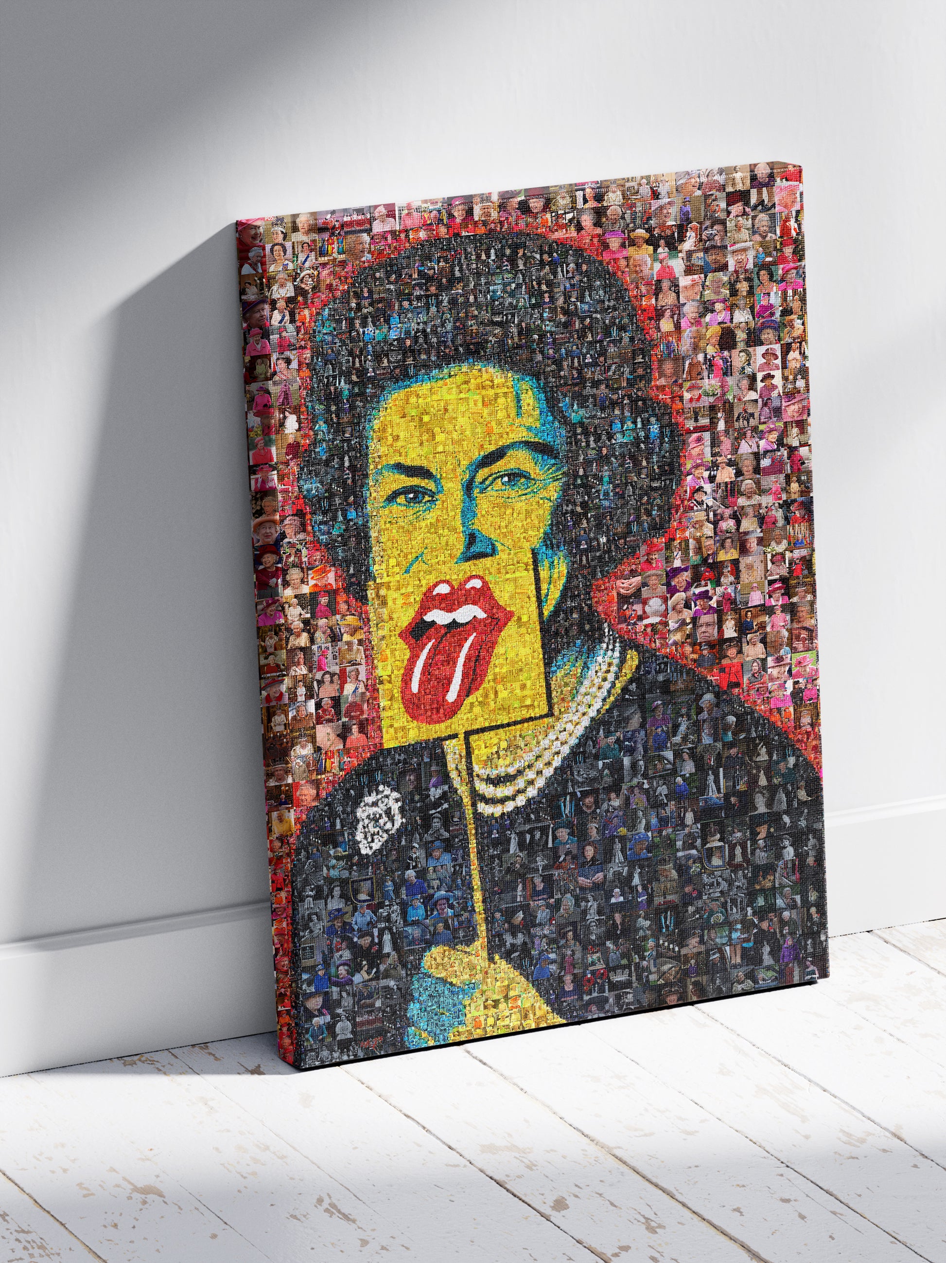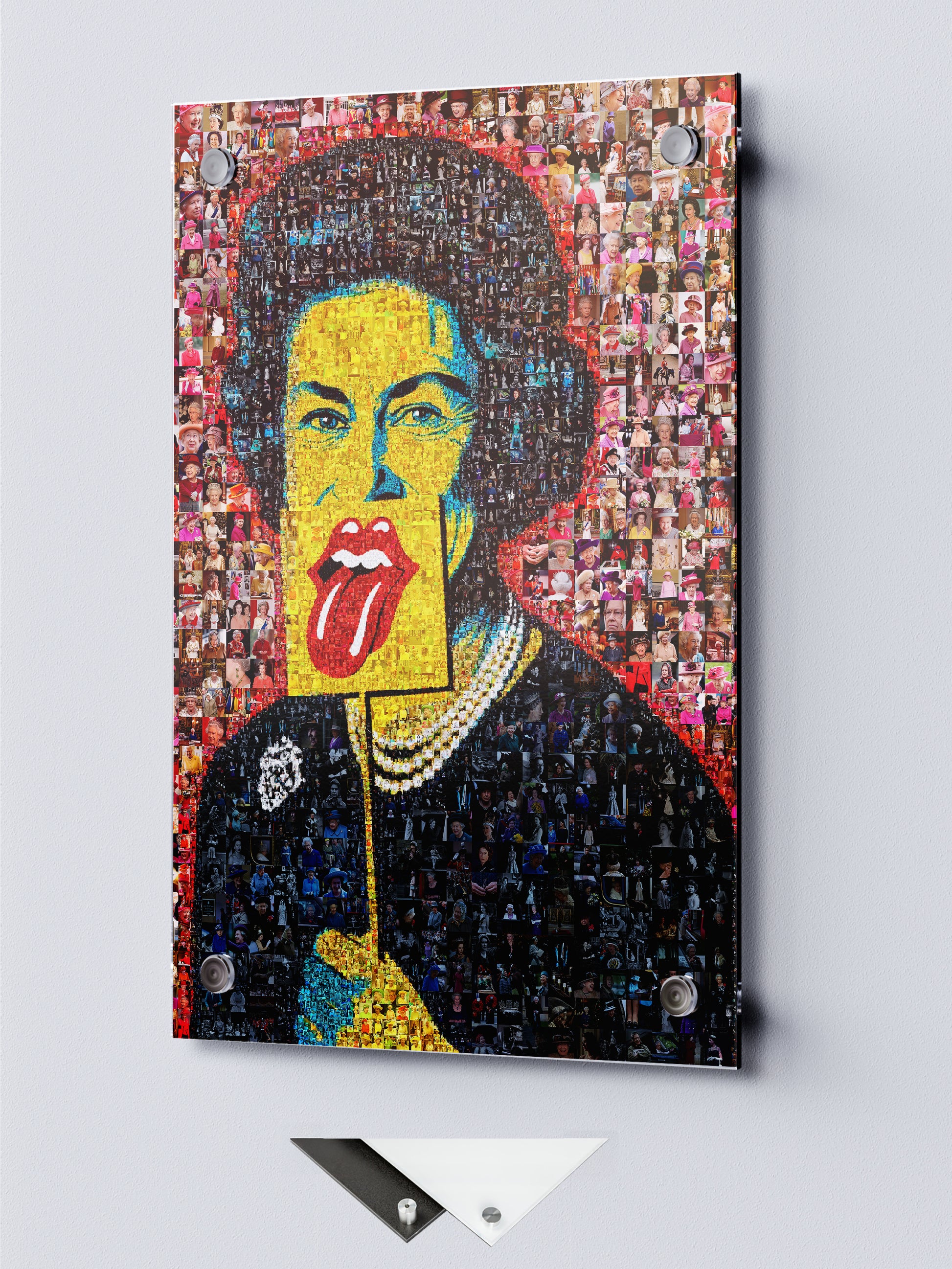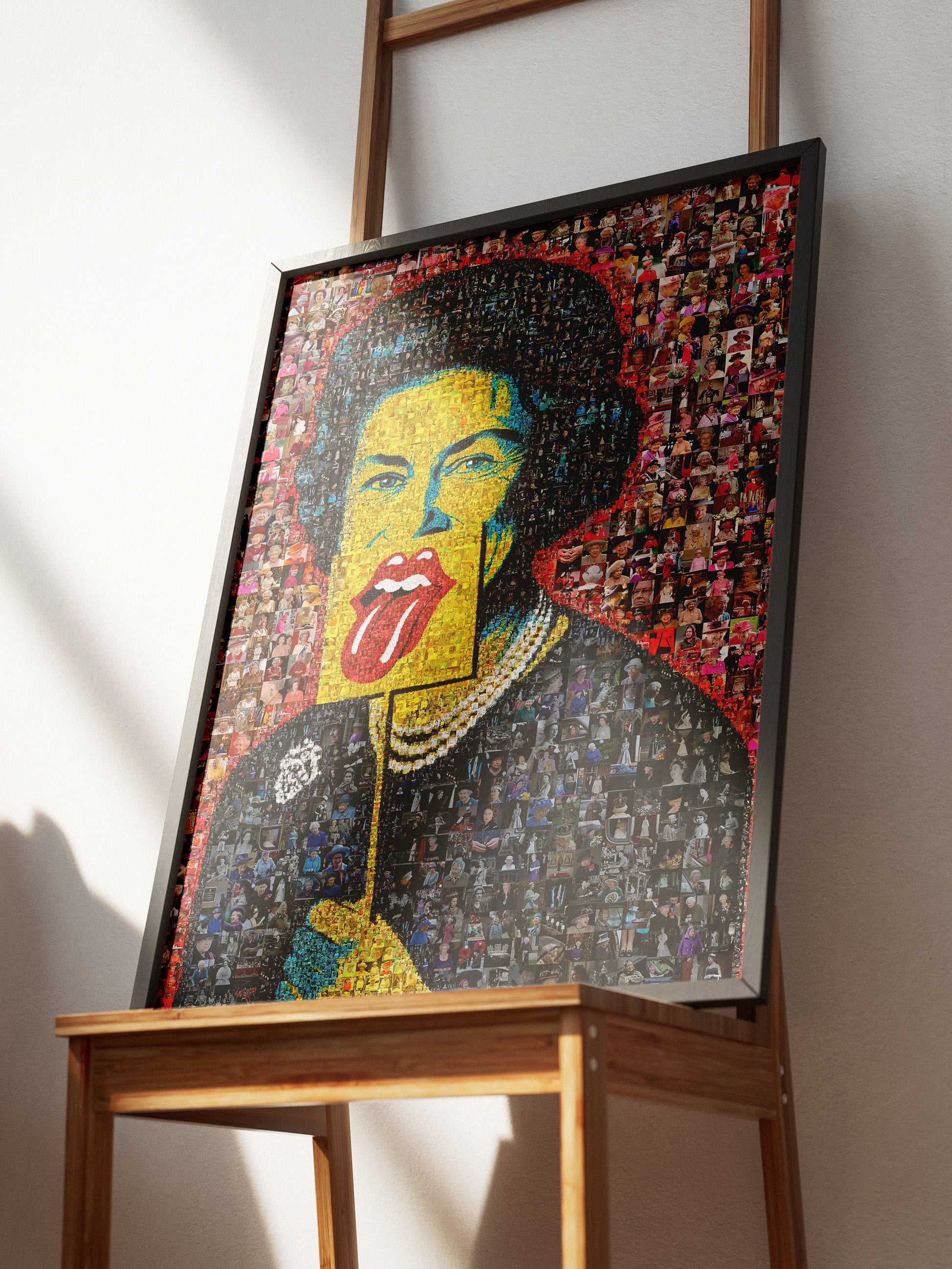 Explore this striking mosaic artwork featuring a bold and playful portrayal of Elizabeth II. This unique piece combines vibrant colors and modern pop art influences to create a captivating image that challenges traditional perceptions of royalty. Perfect for art enthusiasts, collectors, or anyone looking to add a touch of contemporary flair to their space. This artwork is sure to be a conversation starter, blending humor with historical significance. Ideal for display in homes, offices, or galleries, it celebrates the legacy of the former Queen of the United Kingdom in a fresh and innovative way.