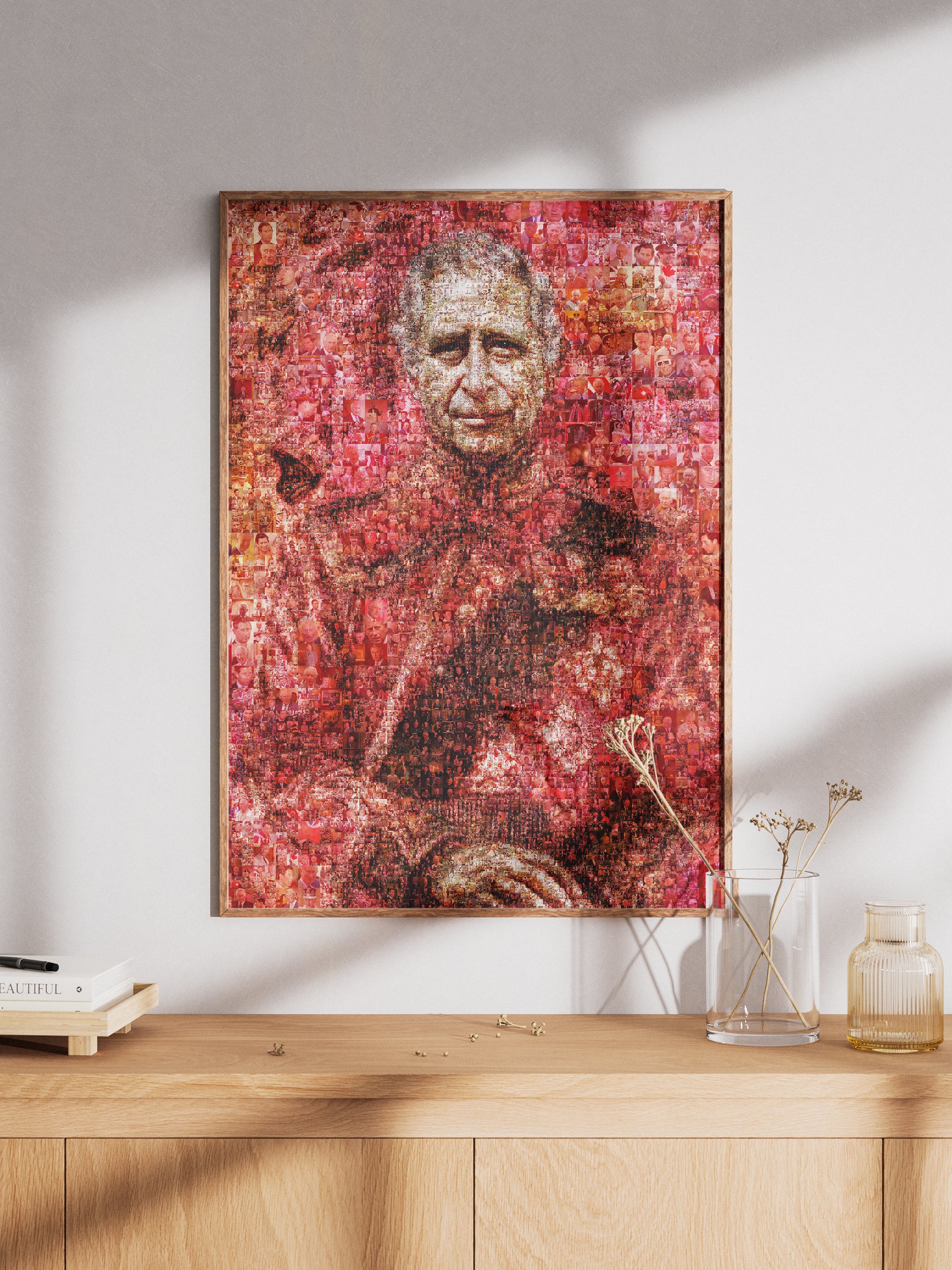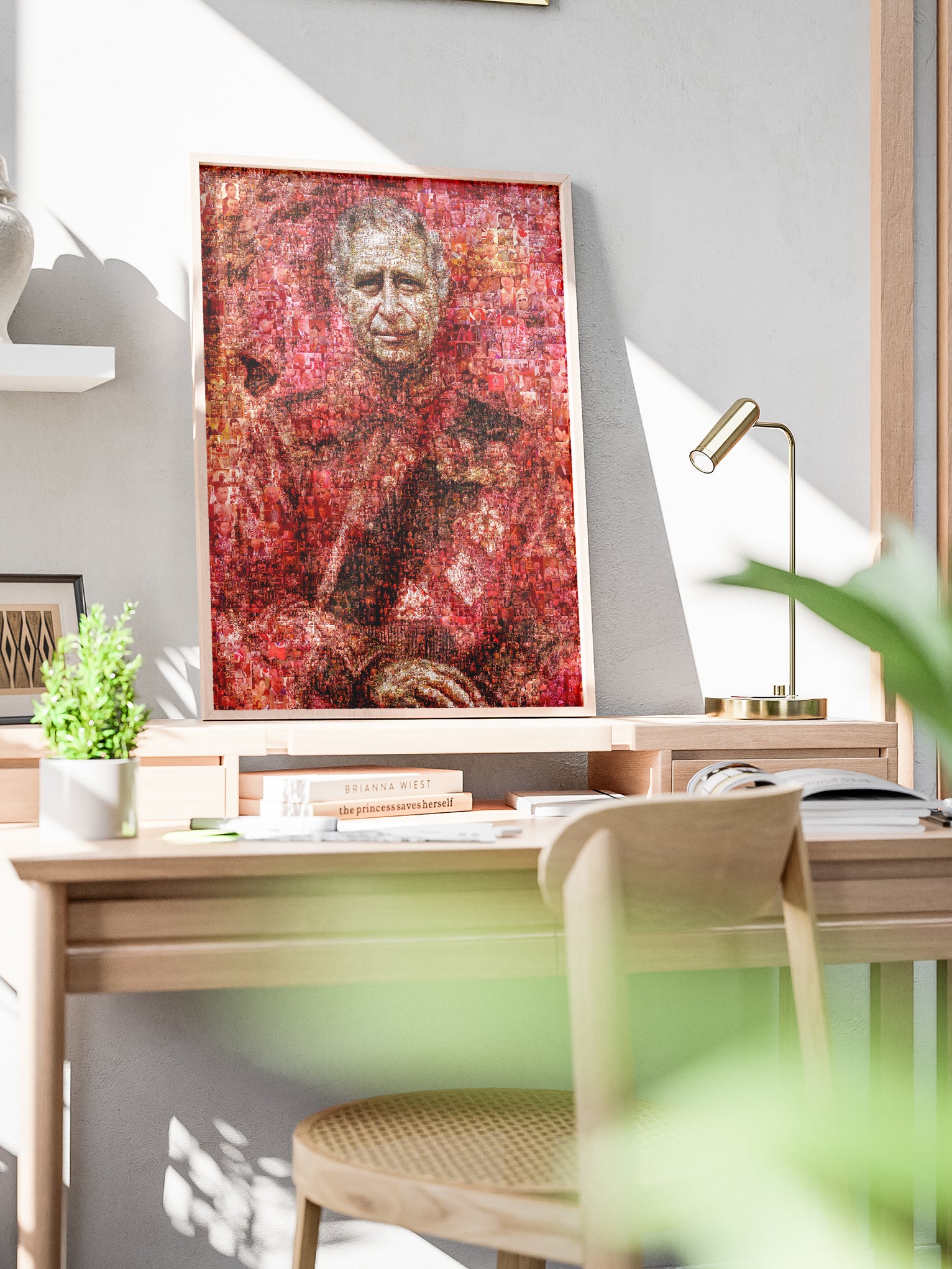 Celebrate the legacy of King Charles III with this stunning mosaic artwork that captures his charismatic smile and royal charm. Perfect for collectors and fans of British heritage, this piece combines vibrant colors and dynamic patterns to create a striking focal point for any room. Ideal for home decor, office spaces, or as a unique gift for royal enthusiasts. Bring a touch of modern artistry and royal elegance into your life with this one-of-a-kind representation of the UK's beloved monarch.